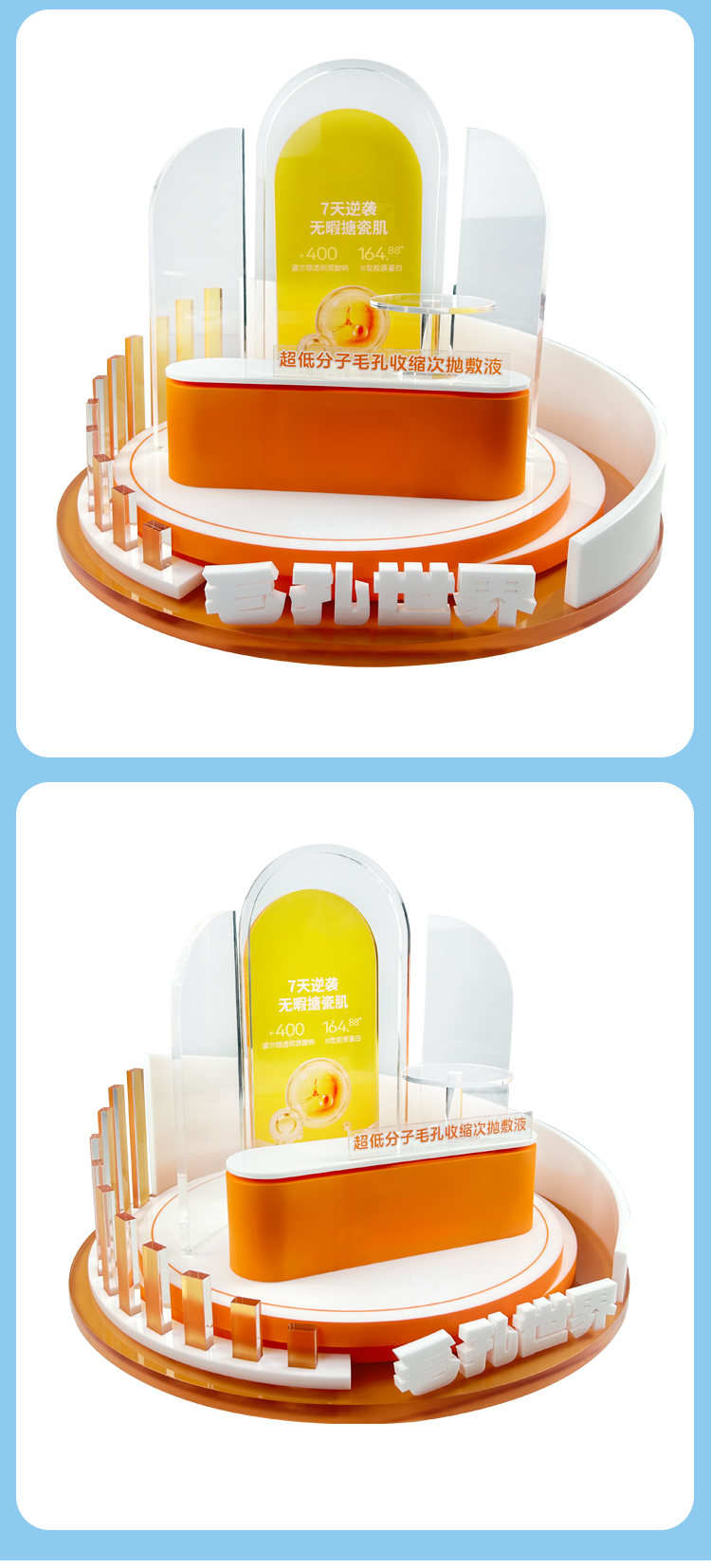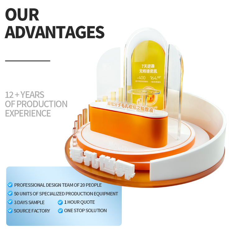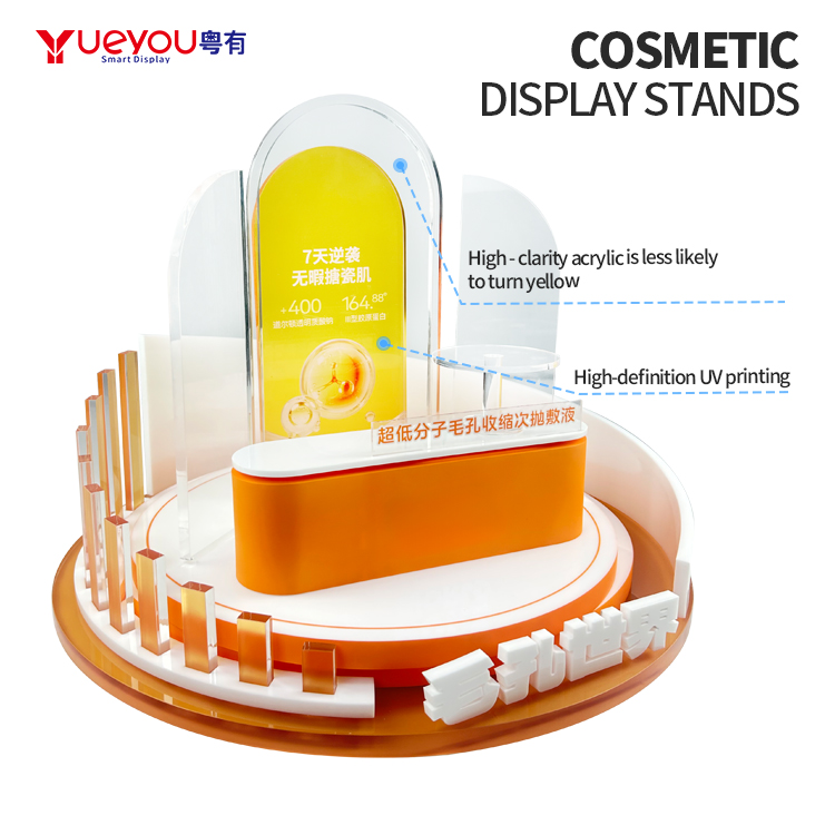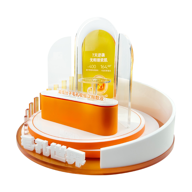 Custom Unique Design Skincare Display Stand with Transparent Tray Multi Tier Cosmetic Display Rack with Curved Backdrop