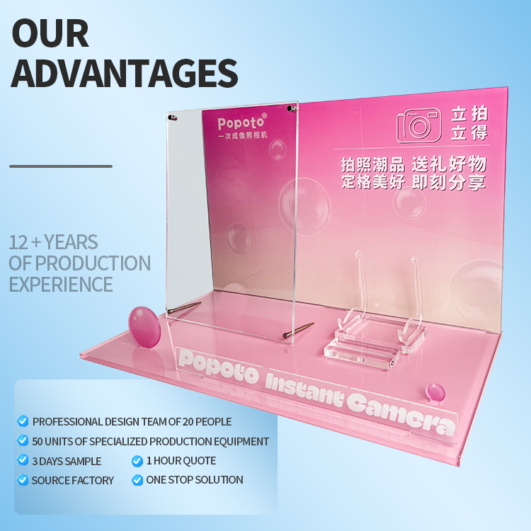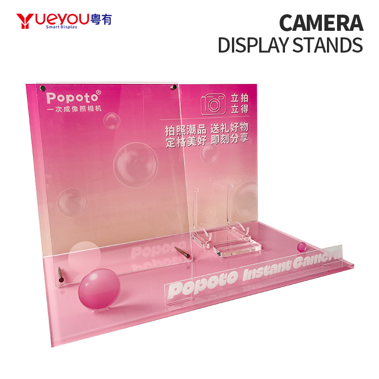 Custom Pink Camera Display Rack Durable Digital Product Display Stand with Transparent Bracket for Retail Store Camera Display